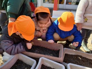 2歳児ばなな組さんは秋にみんなで植えたチューリップの芽を見に行きました。