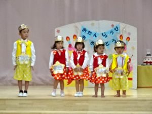 今日は9月生まれのお誕生会がありました🎂ドキドキの表情でステージに上がっていましたが、たくさんのお友達にお祝いしてもらいとても嬉しそうでしたよ😊本日お休みだったお誕生児さんは10月のお誕生会で一緒にお祝いしましょうね♪