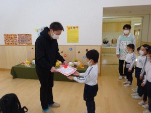 11月23日は勤労感謝の日ということで、いつも指導をして下さる、アルススイミングスクールの山田先生に5歳児ぶどう組さんが園を代表して感謝状をお渡ししました💕「いつも泳ぎ方を教えてくれてありがとうございます。」と上手にお話していました。先生にもとても喜んで頂きました😊