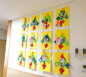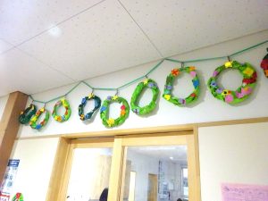 また、玄関には、製作した5歳児さんのクリスマスリースと4歳児さんのクリスマスツリーを展示しています🎄