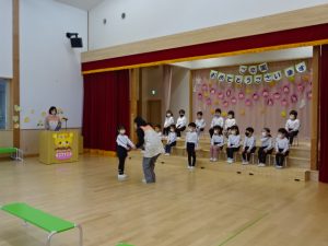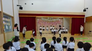 2023.03.20 日々の様子 今日のようす☀ 今日は卒園式の練習を、3歳児もも組さん、4歳児めろん組さんが見に来てくれました👀 お客さんがいることで、緊張気味の5歳児ぶどう組さん😣 ドキドキしながらもかっこいい姿を見せてくれました😊 とても素敵な姿に憧れたもも組さんが、ぶどう組さんの真似をして遊んでいました😊 おじぎをしたり、ステージに歩いていく姿がありましたよ✨ 「並ぶんだよ~」と声を掛け合っていて微笑ましかったです😊 卒園式まであと5日となりました🌸