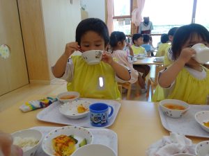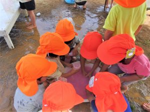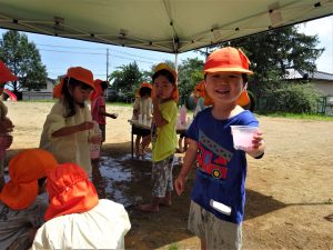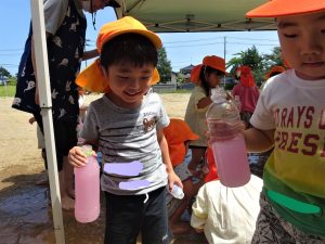 2023.07.21 お知らせ 水遊びを楽しんでいます🌞 今日はとても良いお天気となり水遊び日和でしたね😊 準備体操をしてから、2歳児ばなな組さんは、車やペットボトルのおもちゃを使って 水遊び😆「雨だ~!」とお水を掛け合って楽しんでいました✨✨ 3歳児もも組さんはピンク色の色水を使って楽しんでいました😊 水と混ぜることで色の濃淡に気づくお友だちもいましたよ👀 たくさん遊んだ後は、お給食をもりもり食べました😋 畑で採れたミニトマトがスープに入っていましたよ🍅 今週もありがとうございました😊