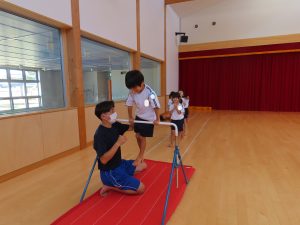 3歳児もも組さんは、鉄棒やマット運動の他に、