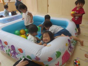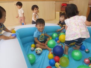 1歳児いちご組さんはお部屋でボールプールをして遊んでいました✨✨