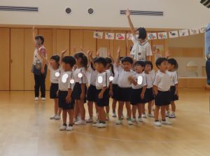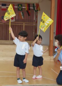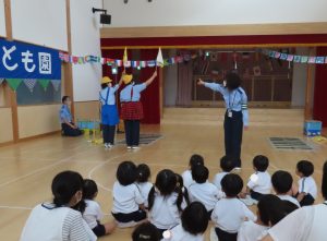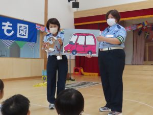 今日は3歳児もも組さんを対象に町の交通安全指導員の方による交通安全教室が行われました😊