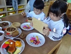 ごちそうに見立てたり、転がしたり、紙で筒を作り、そこに入れたり…と