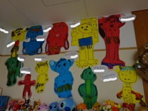 玄関には5歳児ぶどう組さんの追い払いたい鬼の絵が飾られています✨