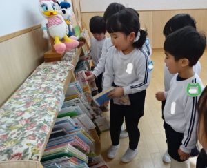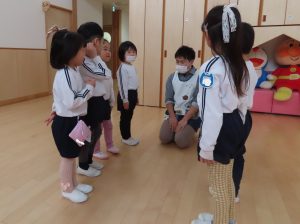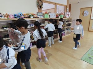 4歳児めろん組さんが、5歳児ぶどう組さんが行っていた係のお仕事を教えてもらっています😊