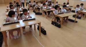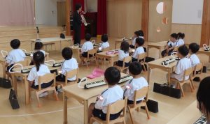 2024.06.05 お知らせ メロディオン指導がありました🎹 今日は3歳児もも組さんのメロディオン指導がありました🎹 初めてのメロディオンにちょっぴり緊張しながらも嬉しそうに参加していました😄💕 講師の先生のお話をよく聞いて、「ド」の音を吹いてみましたよ♪ 音が出ると嬉しそうな表情をしていました😆 最後に先生から演奏のプレゼントをいただきましたよ✨ みんなが良く知っている曲に目をキラキラさせていました✨ これからもたくさんメロディオンに触れて楽しんでいきたいと思います💕 明日はHAC体育教室です😊
