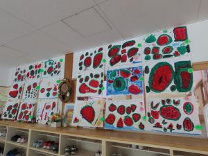 4歳児めろん組さんのすいかの絵を展示しています🍉ぜひご覧ください👀