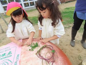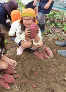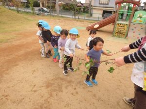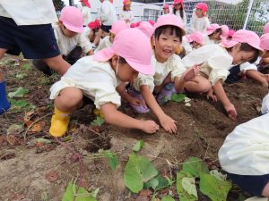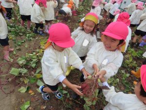 2024.10.24 お知らせ さつまいも掘り🍠 昨日は3・4・5歳児さんで協力してさつまいも掘りをしました! 長ーい蔓や💗の形をした葉にも注目しながら 「うんとこしょ!どっこいしょ!」と掛け声をかけながら掘りました✨ お芋の姿が見えると大歓声が上がり、「おっきい!!」と目を丸くしていましたよ👀 大きなお芋がたくさん収穫でき、どの子も満足気にしていました😆💕 お世話をしてきた甲斐がありますね💗 お芋を収穫した後は、蔓で綱引きや、お相撲をしたり、リースを作って楽しみました😆✨ 2歳児ばなな組さんの蔓の電車ごっこも楽しそうですね🚃