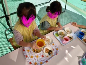 2021.10.08 日々の様子 テラスで給食♪ 今日は曇っていて、すっきりしないお天気ですが、 昨日は暖かい一日でした。 2歳児クラスの子ども達は、テラスにパラソルを出して お外で給食を食べました。 「風が気持ちいいね」 「トンボがいるよ!飛行機の音もするね」 「お外で食べるとおいしいね」 外の空気を感じながらの給食は、とても楽しい時間になりました。