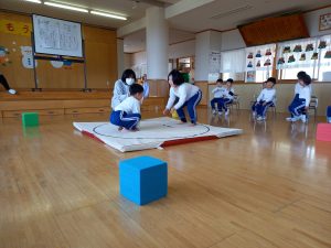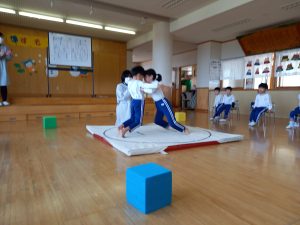 2022.01.25 お知らせ すもう大会がありました。 今日はすもう大会を行いました。 各クラス男女一緒に取り組み、今年の優勝者、準優勝者、第3位、第4位まで決定しました。勝って嬉しそうな表情、負けて泣いてしまったお友達、様々でした。勝負は時の運、勝っても負けても、「よろしくお願いします。ありがとうございました。」のご挨拶はきちんとできました。その後は仲良く給食の時間となりました。 階段に取り組み表が貼ってあります。熱戦の経過をご覧ください。