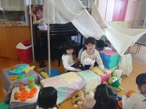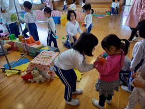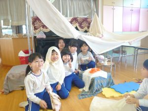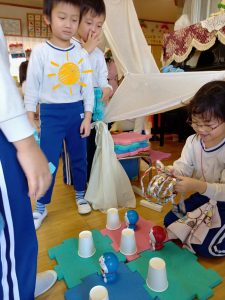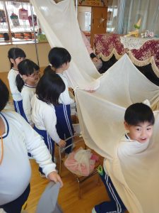 年長さんが担任と一緒に、布を使って何か作り始めました。