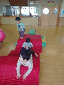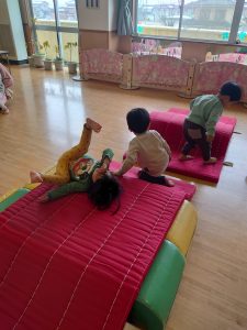 2022.02.10 お知らせ 元気にホールで♪ はな組さんとそら組さんは、 マットのお山に登ったり下りたりして、 元気に体を動かして遊びました。 遊び終わると、マットの上でゴロゴロ休憩😊 ニコニコしながらマットの上を転がっている姿がとてもかわいらしい子ども達でした。