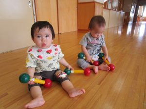 タンバリンを車のハンドルに見立てて動かしたり、たたいたり♪