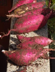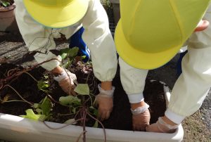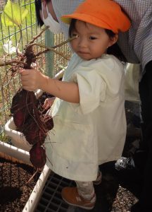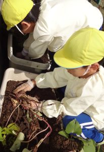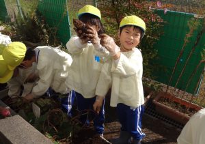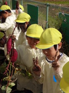 2023.10.24 日々の様子 芋ほり🍠 今日はお天気も良く、汗ばむ陽気となりました。 春から育ててきたさつま芋が大きく生長し、収穫の時期を迎え 芋ほりをしました! 土の感触を楽しみながら、一生懸命掘っていた子ども達! 大きなお芋が顔を出し、歓声があがりました✨ 自分で掘ったお芋を手に、「やった~!」と 満面の笑みを浮かべていました😊 掘ったお芋は、後日焼き芋にしておいしくいただく予定です😋