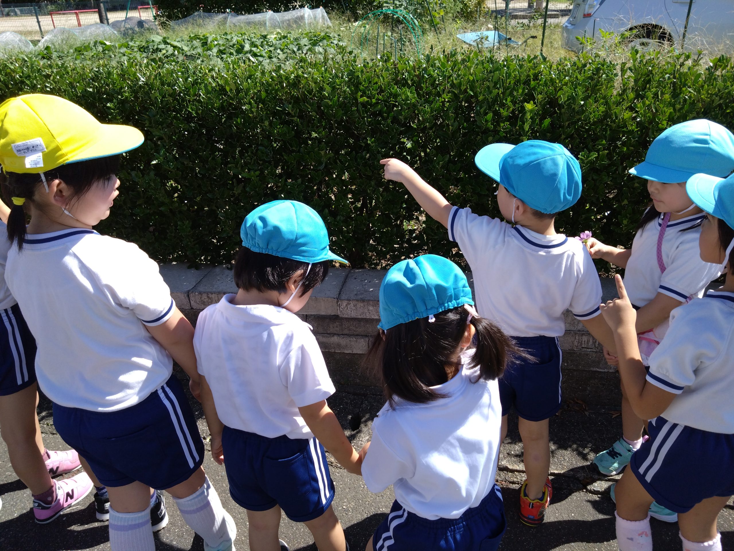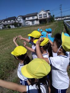 2024.09.26 日々の様子 お散歩日和♪ 気持ちの良い秋晴れの中、お散歩をしてきました😊 赤とんぼがたくさんとんでいました!夢中になって見つめる子ども達。 田んぼの脇から保育園に向かって「おーい!」と手を振ると、先に保育園に戻っていたそら組さん、ほし組さんから「おーい!」と返事が返ってきました🎵 田んぼもすっかり稲刈りが進みました。刈りたての田んぼはこの時期だけの景色ですね。