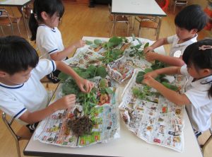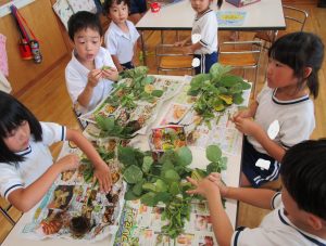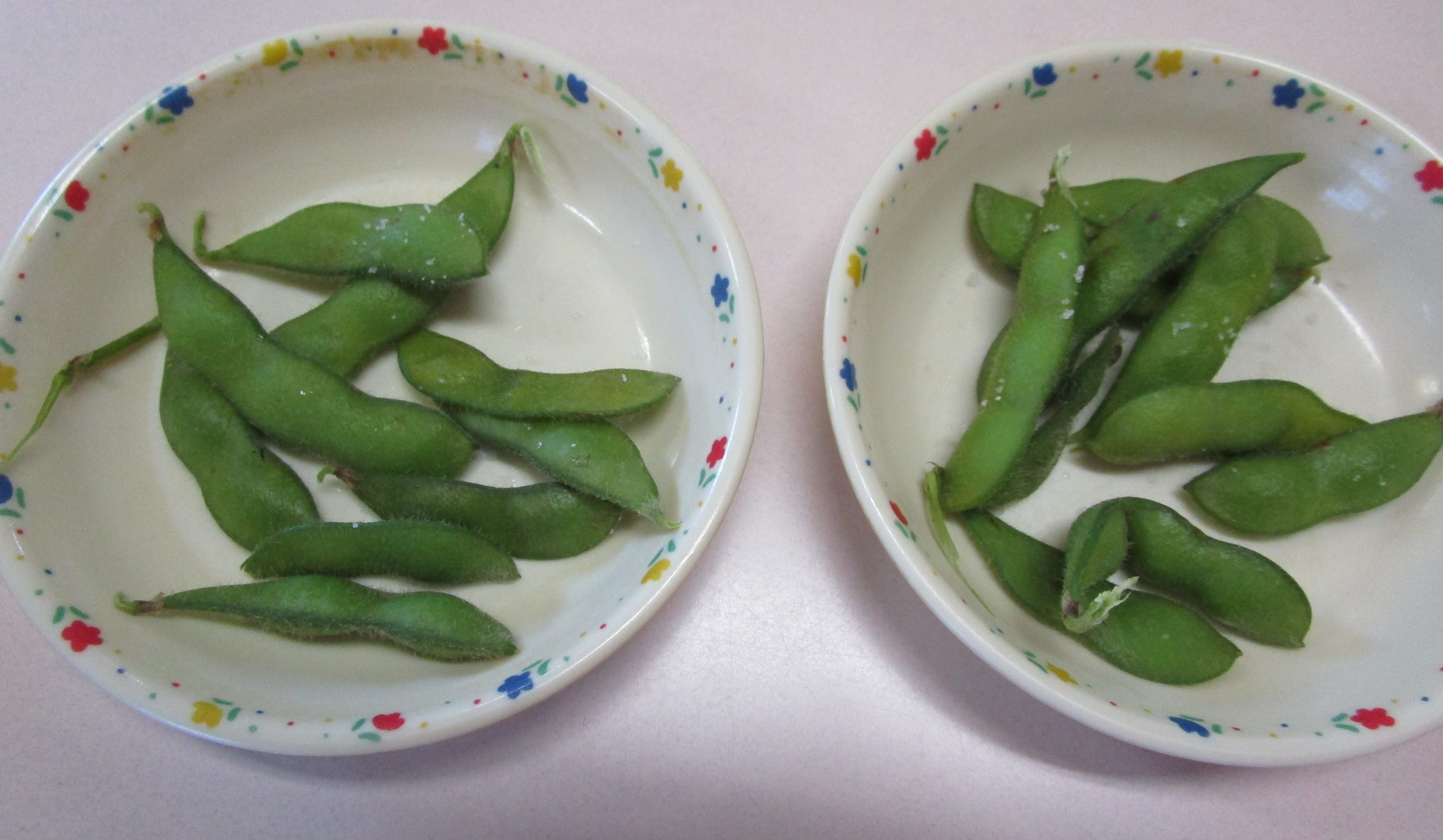 上手にもいだ枝豆は給食室で茹でてもらい、