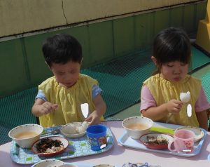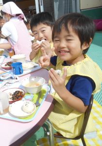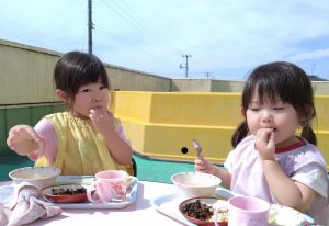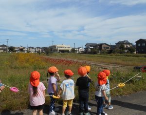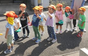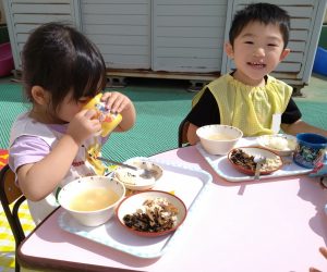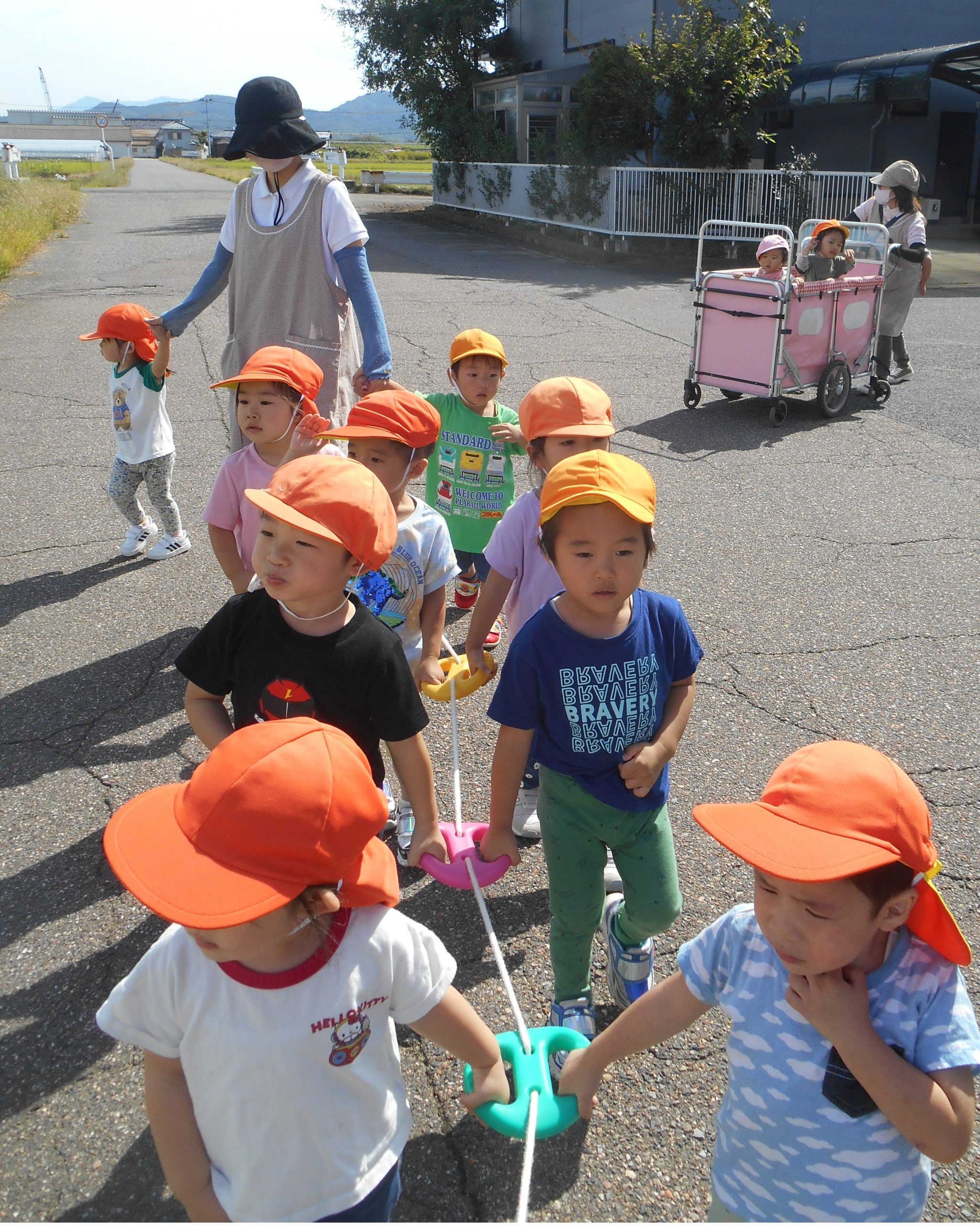 秋の気持ちの良い風の中、お散歩にお外での給食と