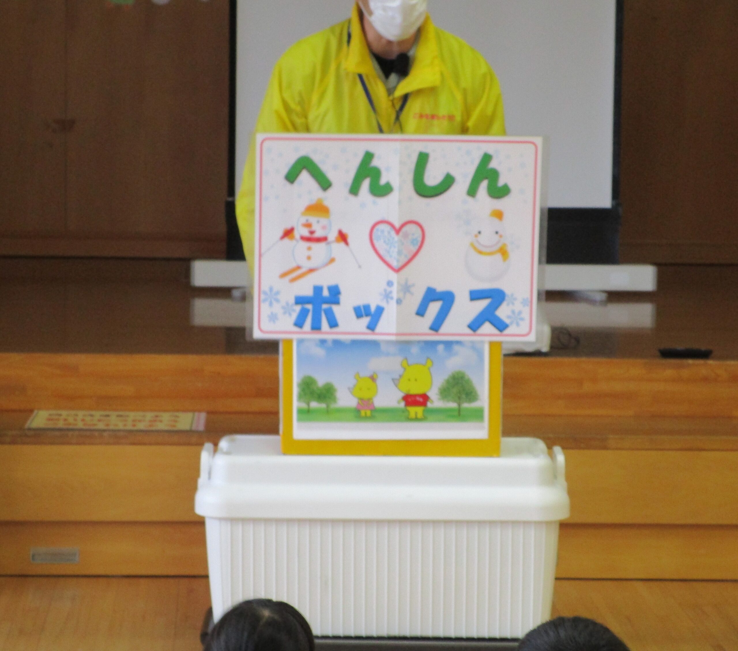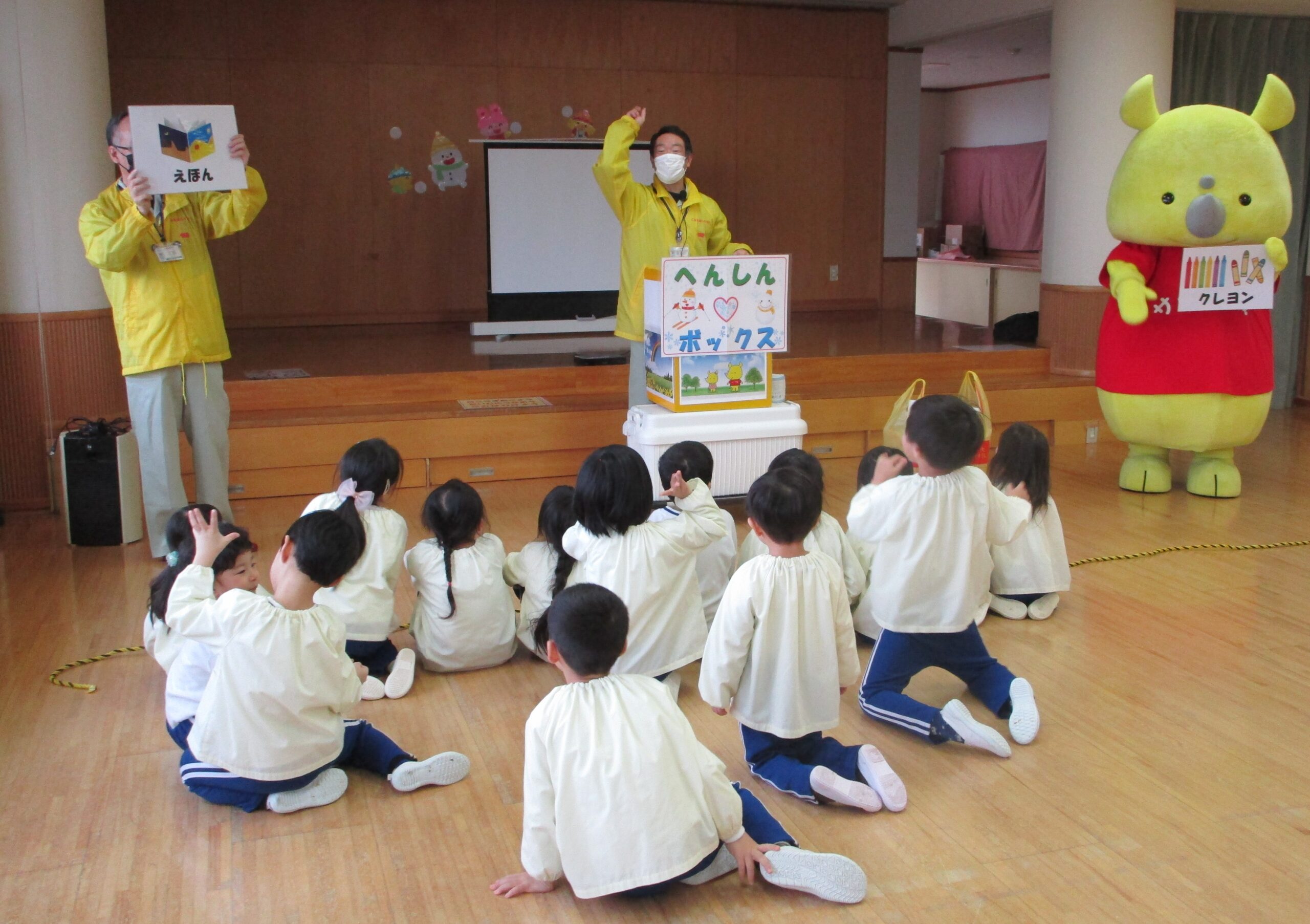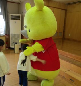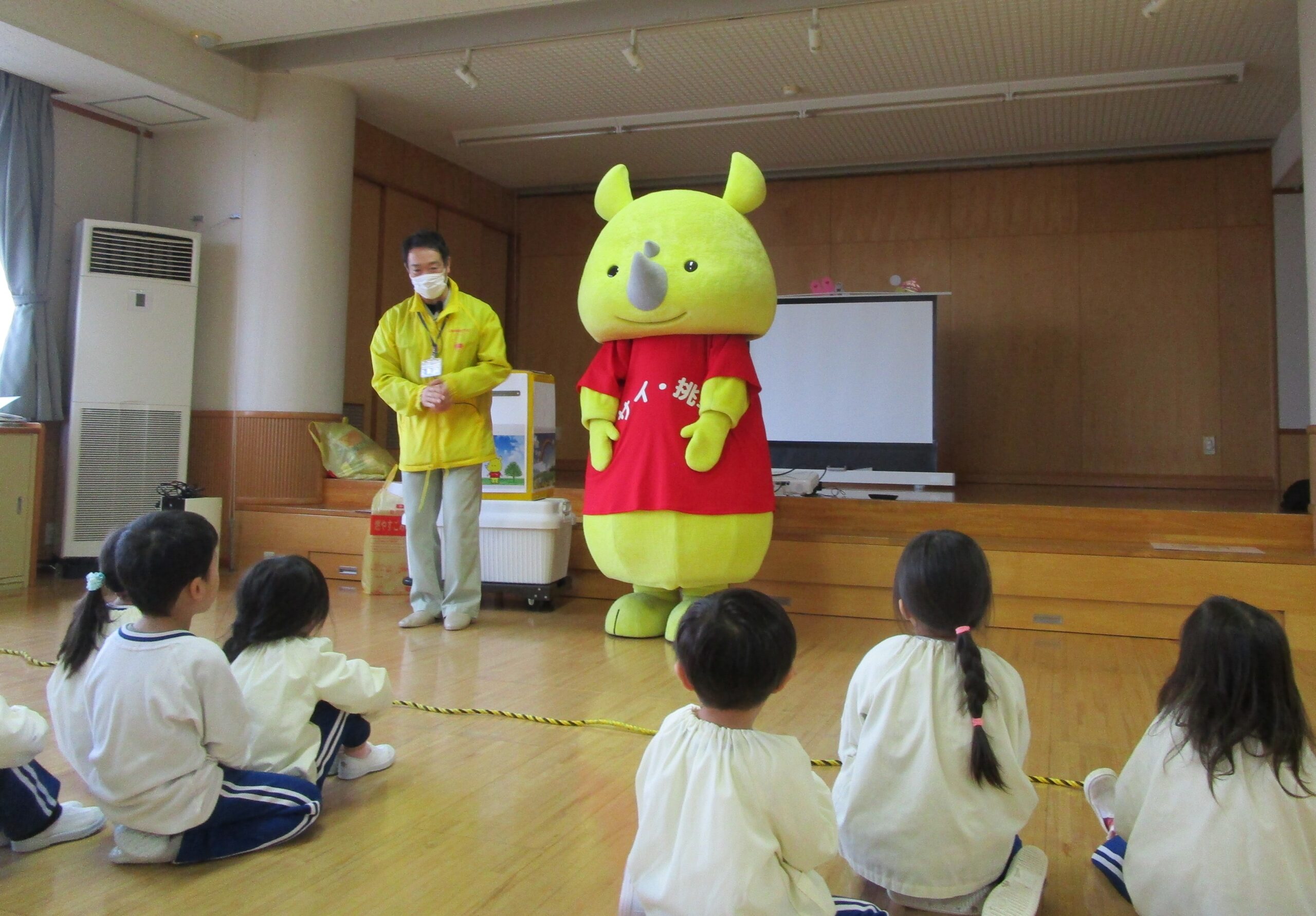 サイチョ君も一緒にペットボトルや新聞紙が