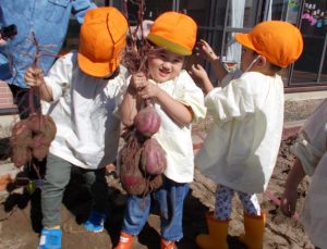 小さいおててで一生懸命 土を掘り・・・お顔より大きなお芋がとれました!