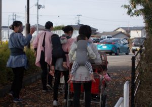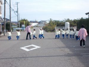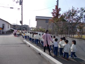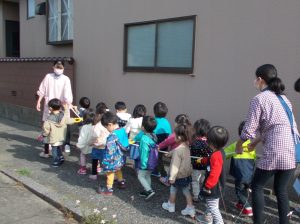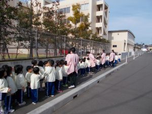 2021.11.01 お知らせ, 日々の様子 避難訓練 今日は月に一回の避難訓練を行いました。 大きな地震がきたことを想定し、揺れがおさまるまでテーブルの下に隠れ 身の安全を守る訓練!その後、避難所となっている近くの小学校へ向かいました。 小学校へ避難する際も、交通ルールをしっかり守って歩くことが出来ました!