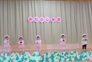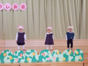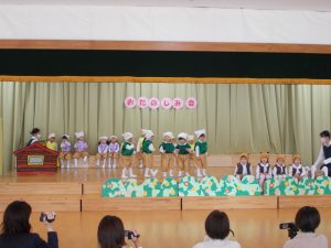 2021.11.18 お知らせ, 日々の様子 未満児おたのしみ会 今日は、未満児さんの“おたのしみ会”が行われ、手遊びやお遊戯、 オペレッタの発表をしました。 幕が開くとお家の方を見つけて手を振る子ども達。 ドキドキしていたお友だちも、大好きな曲が流れるとリズムに合わせて 体を揺らし、可愛らしい姿をみせていました。 ステージでの発表を終え、保育室に戻った子ども達の表情はとても生き生きと して、いい笑顔でした😊 温かい拍手をありがとうございました。