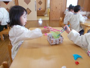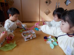 今日はストローをお箸に見立て、いろいろな形のものを挟んでみました。