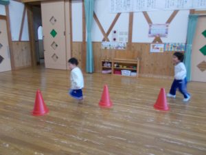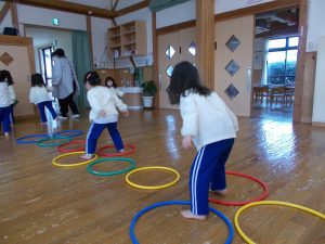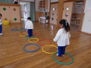 さくら組(3歳児)さんは、マットやフラフープを使い