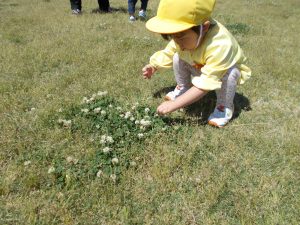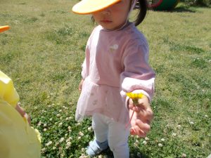 園庭に咲いているたんぽぽやシロツメクサを摘み取り、小さな手に握りしめて