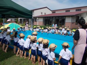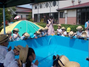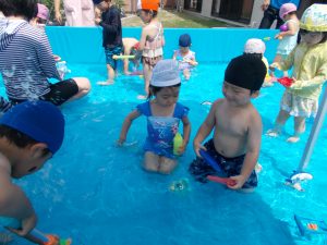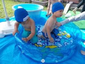 じょうろや水鉄砲で遊んだり、お水に触れて「気持ちいいね!」と