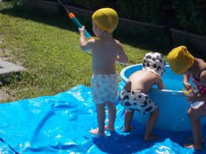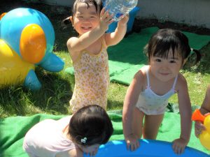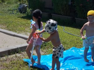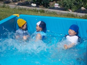 2022.08.19 日々の様子 夏を満喫! 今日は久しぶりによく晴れ、水遊びを楽しみました! お水を上手にくめるようになったもみじ組さん。 ペットボトルのシャワーで楽しみました😊 「冷たくて気持ちいい~!」水しぶきを上げて、ダイナミックに遊んでいました。