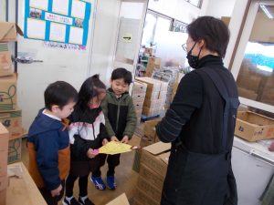 2022.11.28 日々の様子 感謝の気持ちを込めて♡ いつもお世話になっている八百屋さん! 感謝の気持ちを込めて スマイルはじめ保育園みんなの代表として すぎ組(年長)さんが「いつもありがとうございます♡」 と感謝状をプレゼントしました! たくさんの方のおかげで、元気いっぱいに過ごしています😊 八百屋さんからは、シクラメンのお花を頂きました。 みんなで大切に育てます。 ありがとうございます✨