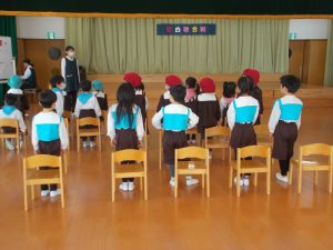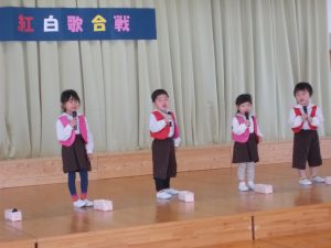 紅組、白組に分かれて、グループごとにクラスの歌を発表する子ども達。