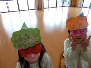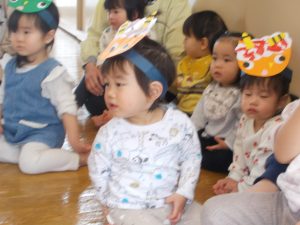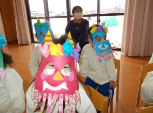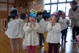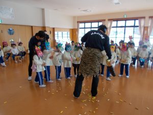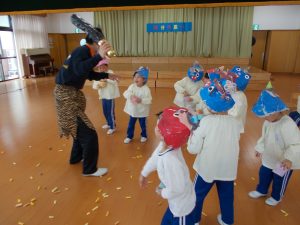 2023.02.03 日々の様子 節分の集い👹 2月3日・・・今日は節分ですね! 「鬼は~そと!福は~うち!」 子ども達の元気いっぱいの声が響きました。 「鬼はそと~福はうち~パラパラパラパラ豆の音~♪」 豆まきの歌をみんなで歌い、節分の由来を聞きました。 そのあとは・・・いよいよ豆まきです👹 各クラス、いろいろな素材で作ったお面をかぶり、力強く豆を投げて 鬼さんを退治しました✨ みんなの心の中の〇〇鬼さんは、逃げて行ったかな・・・?!😊