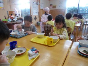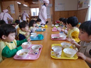 2023.02.24 日々の様子 もうすぐ進級! 今年度もあと一ヶ月となりました。 わくわく!どきどき!進級することを 楽しみにしている子ども達。 今日はひと足早く、進級するお部屋で給食を いただきました。 もみじ組さんはかえで組さんのお部屋で・・・ かえで組さんはさくら組さんのお部屋で・・・ テーブルの大きさや、椅子の高さも変わり、 お兄さん・お姉さんになった気分を味わいながら、 美味しくいただきました😊