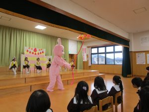 2023.11.30 お知らせ お誕生会🎂 11月28日(火)は11月生まれさんのお誕生会でした。 インタビューや歌の発表、3歳以上児さんは、保護者の方をご招待し、 お祝いしました。 ダンスの発表やお楽しみコーナーもあり、みんなで楽しみました。 給食も美味しかったですね。メニューは・・・ 【パン、かぼちゃのポタージュ、鶏肉の味噌つけ焼き、 ブロッコリー、フライドポテト】でした。 かぼちゃのパンはフワフワで好評でした!! 楽しいお誕生会となりました。 お誕生会のご参加、ありがとうございました。