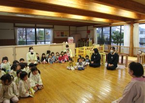 今日は、未満児さん・以上児さんに分かれて朝のお集まりを