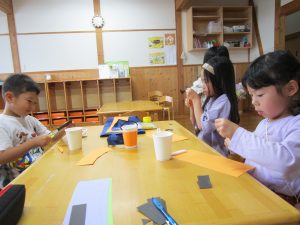 ゲームのあとは制作を行い、かわいいハロウィンのお菓子入れを作りました。