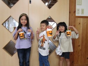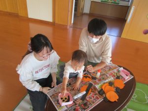 その後は、かぼちゃのお面づくりや自由遊びをしました。