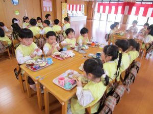 リハーサルの後、3歳以上児クラスさんはホールで会食を