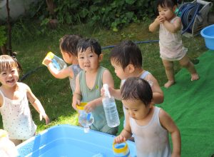 未満児クラスのお友達は・・・水遊びを楽しんでいました。
