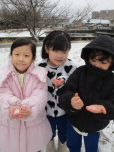 少しですが、園庭が白く染まりました。つばき組さんは外へ行き、
